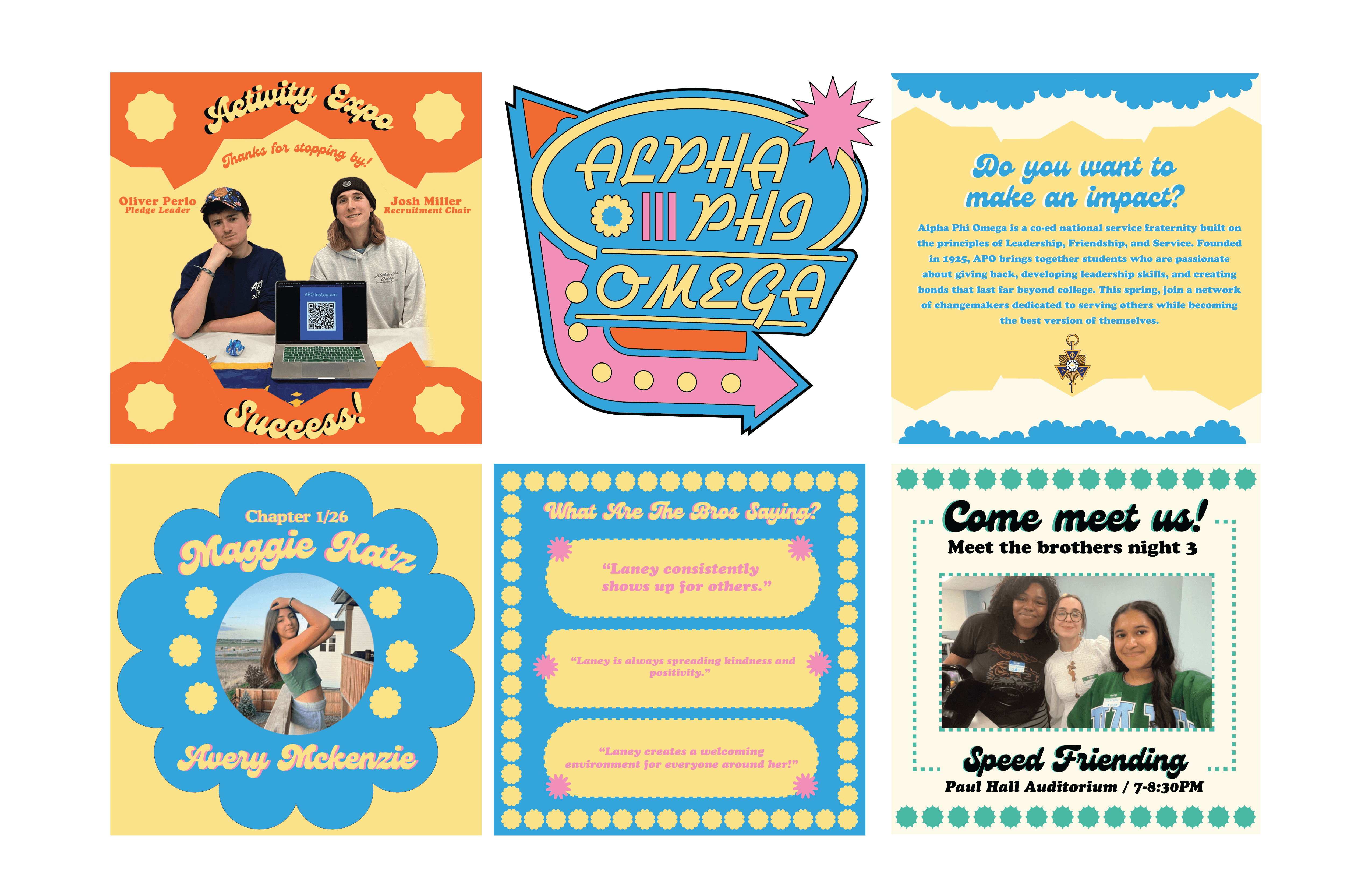 As marketing chair for Alpha Phi Omega, a national service fraternity on Tulane's campus, I executed a fully updated rebrand of our organization. Through this project, I was able to design for numerous, flexible layouts: Posters for recruitment, social media posts, chapter merchandise and an organized slide-deck for community meetings.