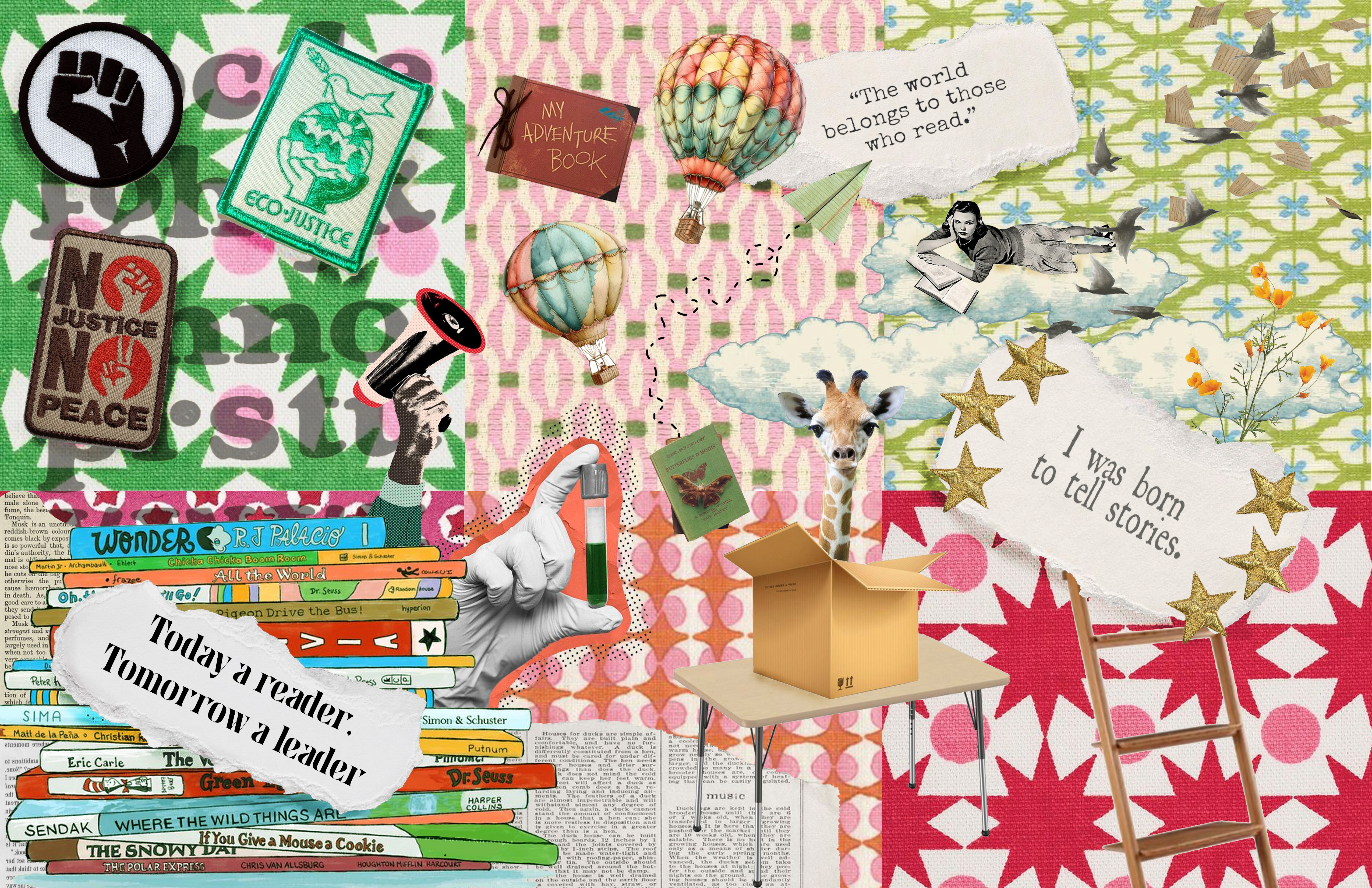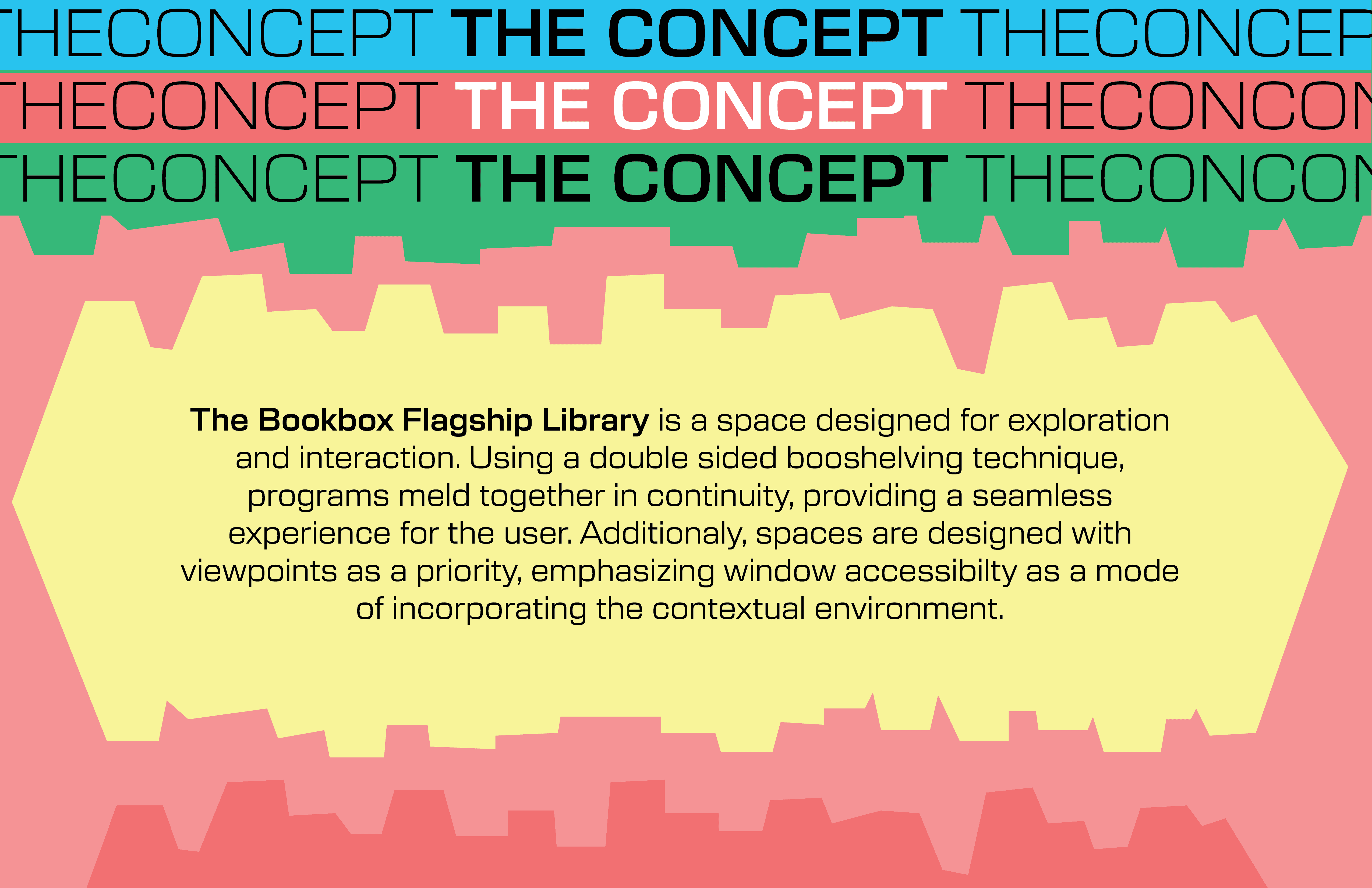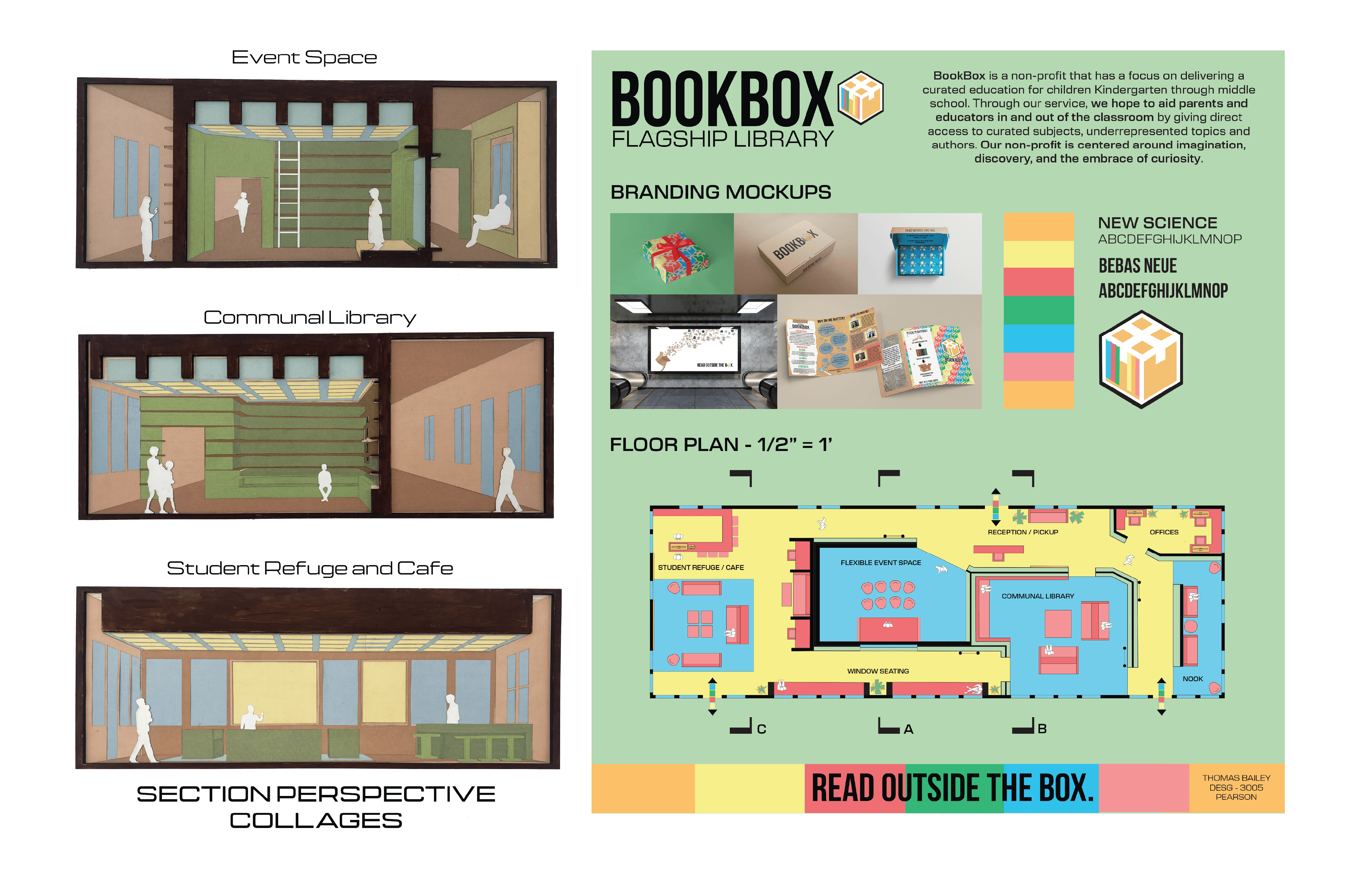 The BOOKBOX flagship library started first as a Non-profit branding project. Expanding my design further, I set out to answer how my organization could be represented spatially. Section collages made from wood and paper.